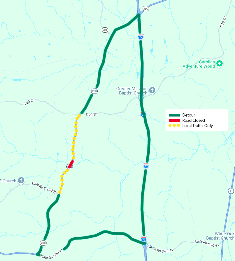 During the construction period, motorists will be diverted onto a 13.14-mile detour. The SCDOT-approved route will utilize S.C. 200, Interstate 77, and Old River Road (S-20-41).