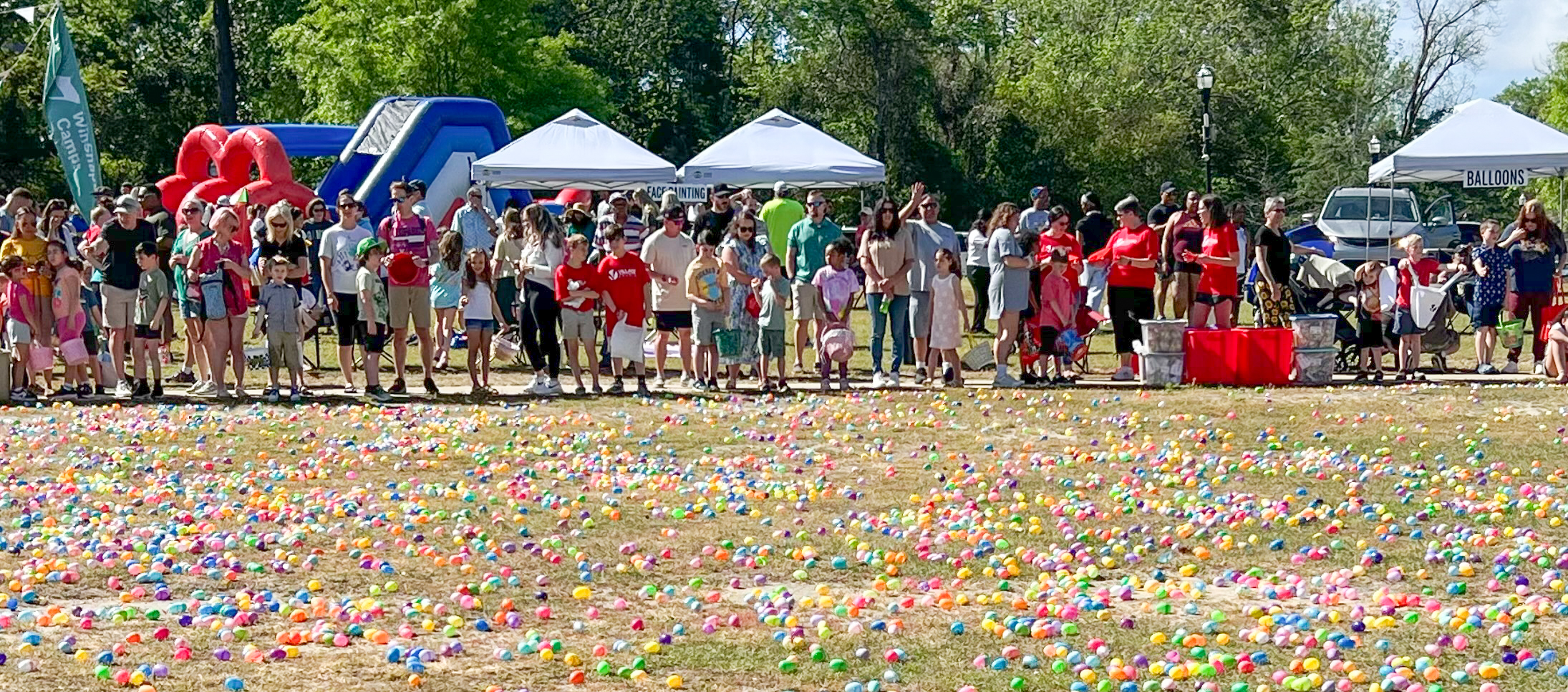 After a prayer by Village Church Pastor Erik Estep, the kids were on the hunt, chasing down more than 22,000 plastic eggs that they exchanged for bags of candy before heading to the food tent with their families for free hot dogs and barbeque sandwiches with all the trimmings.