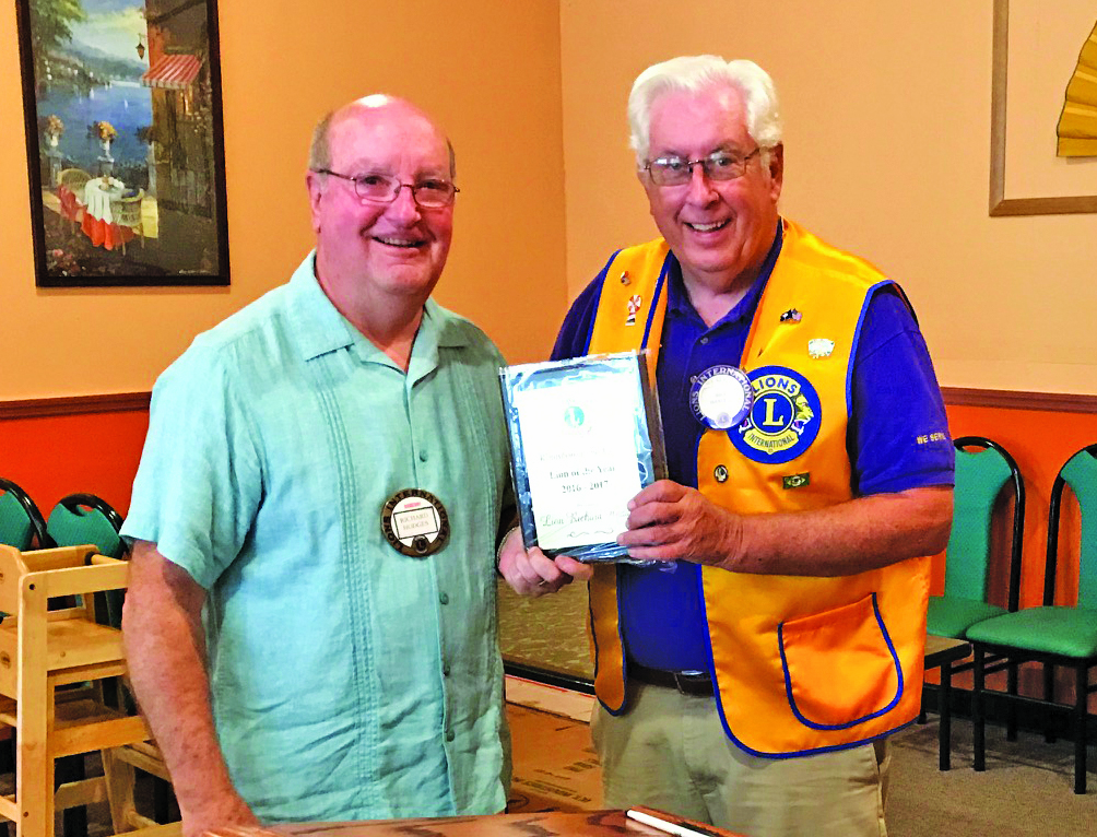 Richard Hodges of the Winnsboro Lions Club was recently named 2016-2017 “Lion of the Year.” In addition to having served as club secretary for three decades, Hodges also heads up the club’s eye exams and glasses provision program and serves as chaplain for the club. Winnsboro Lions President Bill Haslett, right, presented a “Lion of the Year” plaque to Hodges during a recent club meeting.