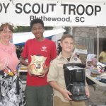 Scout Mom Liz White and Troop 366 Boy Scouts Anthony Mitchell and Daniel White stake out territory at last weekend’s Big Grab in front of Blythewood Consignment to sell merchandise to benefit the Troop.