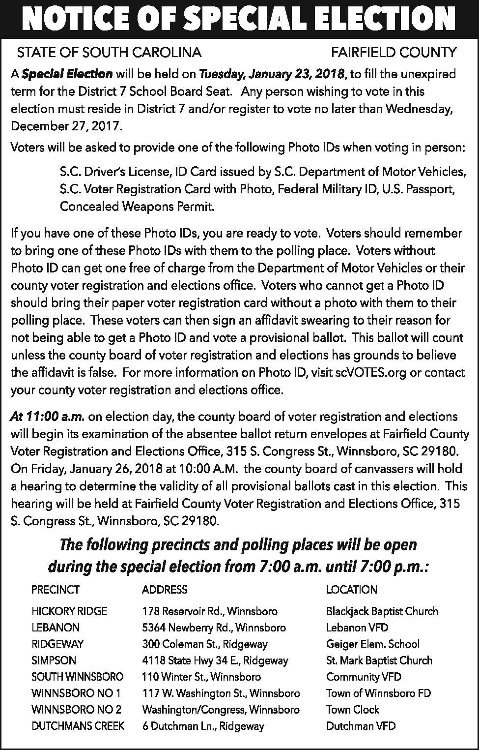 Notice of Special Election: Fairfield County District 7 School Board Seat