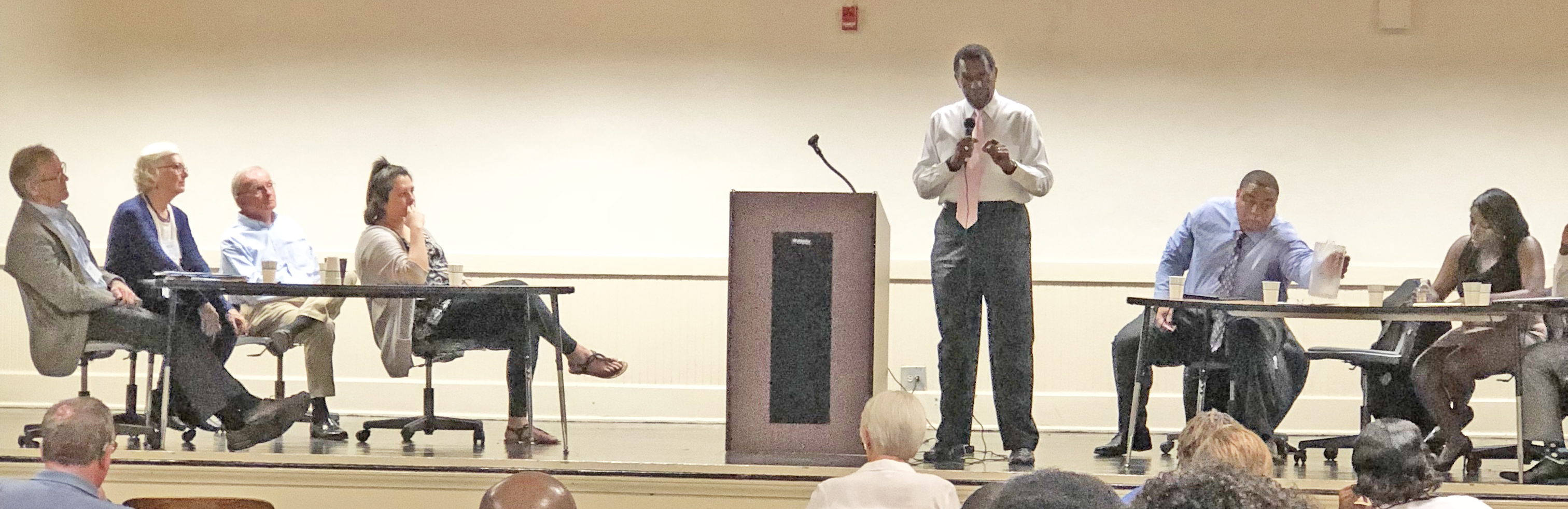 BLYTHEWOOD – Blythewood Democratic candidate forum organizer Stuart Andrews, left, emcee Arlene Andrews and moderators Buddy Price and Jamie Harkness listen as incumbent SC House...
