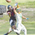 Kaden Briggs goes over a C.A. Johnson defensive back during Westwood High School’s home workouts with Richland Northeast, Lugoff-Elgin and C.A. Johnson last Thursday. The Redhawks will host another 7-on-7 at 5:30 p.m. on July 23.