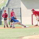 Alex Guess makes the stretch at first as Landon Caulder and Kenshin Byun take note and Redhawk first baseman Jackson Evans dishes out a few pointers.
