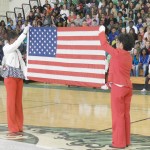 Kelly Mill Middle School teachers Nyisha Williams, left, and Tzarina Salomon display the American flag during a solemn Veteran’s Day program in the school’s gym Monday. A number of schools in Fairfield County and Blythewood honored veterans in ceremonies this week.