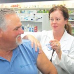 Blythewood Mayor J. Michael Ross smiles bravely as he demonstrates for his constituents the importance of getting flu shots early in the season. Pharmacist Janet Thames of Blythewood Pharmacy administered the injection, which, the Mayor readily admitted, “didn’t hurt a bit.” Flu shots are available at the pharmacy during most store hours.