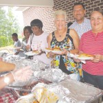 Eddie Nelson, owner of Nelson’s Funeral Home in Ridgeway, visits with Anna Moore and Sheila Brown in the buffet line during the funeral home’s annual community appreciation day Aug. 11.