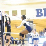 Blythewood’s Brittany Mims leaps to make the return against Ridge View Tuesday. The Lady Bengals dropped the Lady Blazers in straight sets, 25-10, 25-17, 25-17.