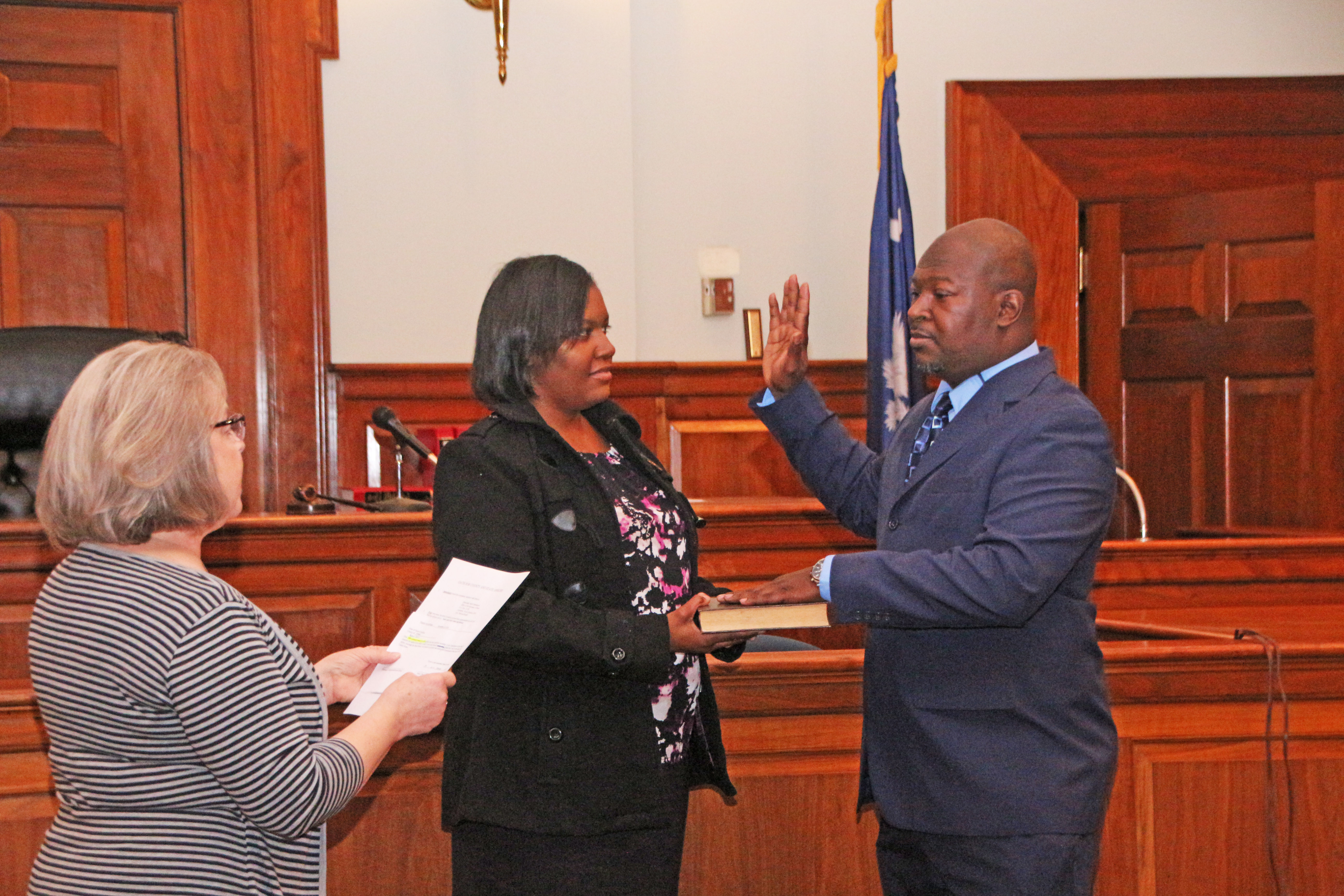 WINNSBORO – Newly elected Fairfield School District school board member Darreyl Davis is sworn into office by Fairfield County Clerk of Court Judy Bonds during ceremonies at the Court House last week. Holding the Bible is Davis’ wife, Tamika.