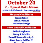 BLYTHEWOOD – The Voice of Blythewood will host the 2019 Blythewood Candidate Forum at Doko Manor Thursday, Oct. 24 from 7 – 9 p.m. Doors open at 6:30 p.m. The forum will feature four of five candidates for town council and three candidates for mayor. Council candidate Barry Belville will not be in attendance. Town […]