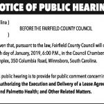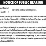 State of South Carolina County of Fairfield NOTICE OF PUBLIC HEARING BEFORE THE FAIRFIELD COUNTY COUNCIL Notice is hereby given that, pursuant to the law, Fairfield County Council will conduct a public hearing on the 10th day of December, 2018, 6:00 P.M., in the Council Chambers, Fairfield County Governmental Complex, 350 Columbia Road, Winnsboro, South […]