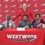 BLYTHEWOOD – Westwood defensive back TJ Blanding, seated center, signed last week with Lenoir Rhyne University. Blanding finished his senior season with 50 tackles, one offensive touchdown, and two punt returns for touchdowns. Pictured with Blanding are Ted Blanding Sr., seated left, Head Coach Dustin Curtis, standing, and Stephanie Blanding, seated right.